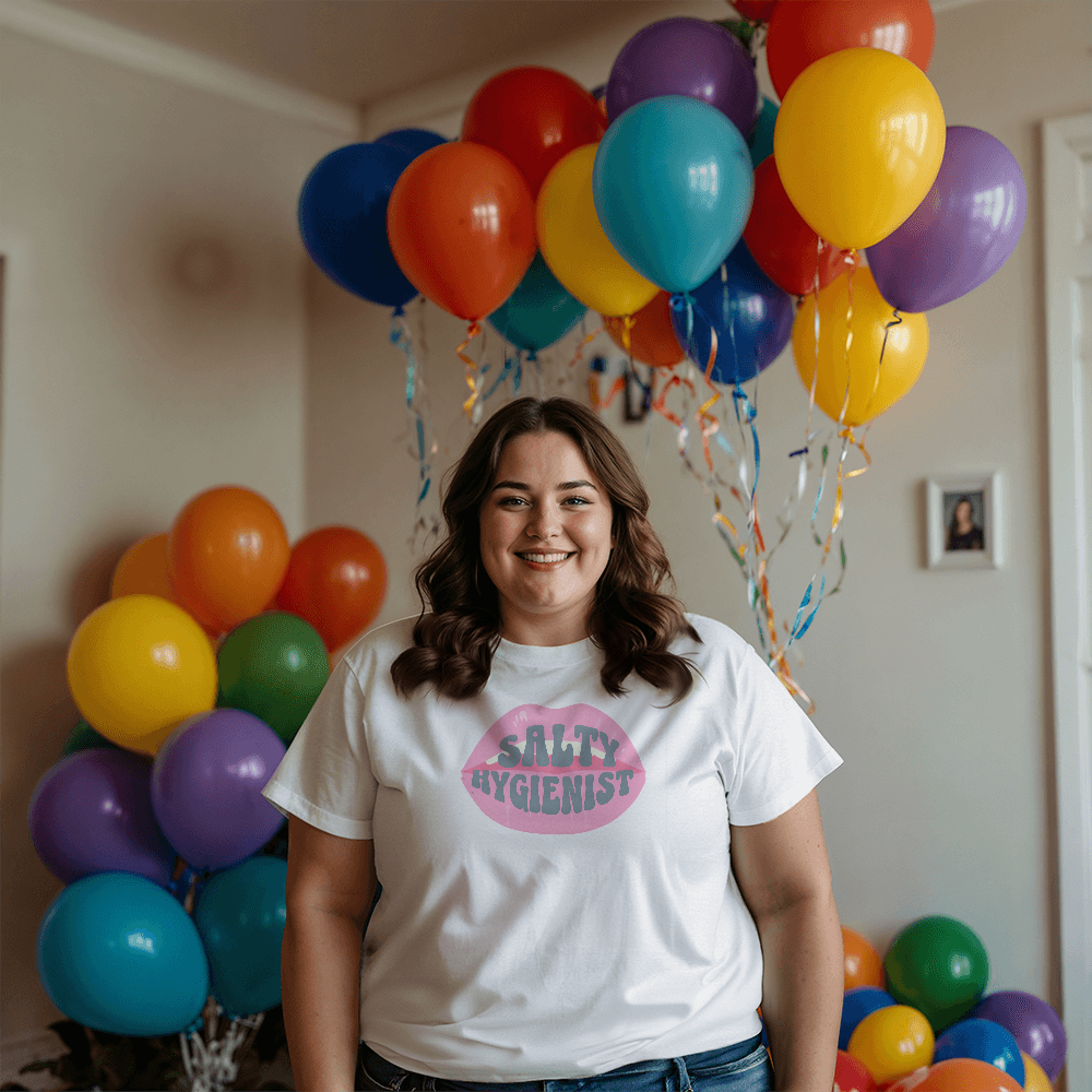 Bring some sass and sparkle to scrubs life with the Salty Hygienist Logo Tee — a must-have for dental pros who love clean teeth and a little attitude.